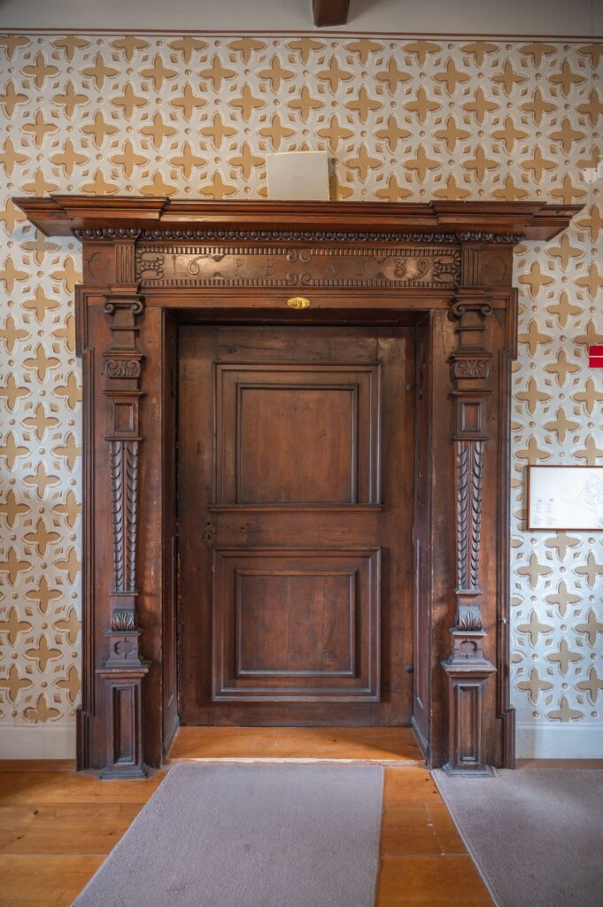 Na ulazu u baroknu sobu na drugom katu dvorca na nadvratnoj gredi drvenih vratnica izrezbaren je natpis: 16 PB AS 39. Slova se mogu tumačiti kao skraćeni nazivi latinskih riječi presbyter  i ara sacra, a brojke kao godina 1639., što bi upućivalo da je u toj prostoriji bila uređena kapela, a u prostoriji do nje boravio svećenik.
