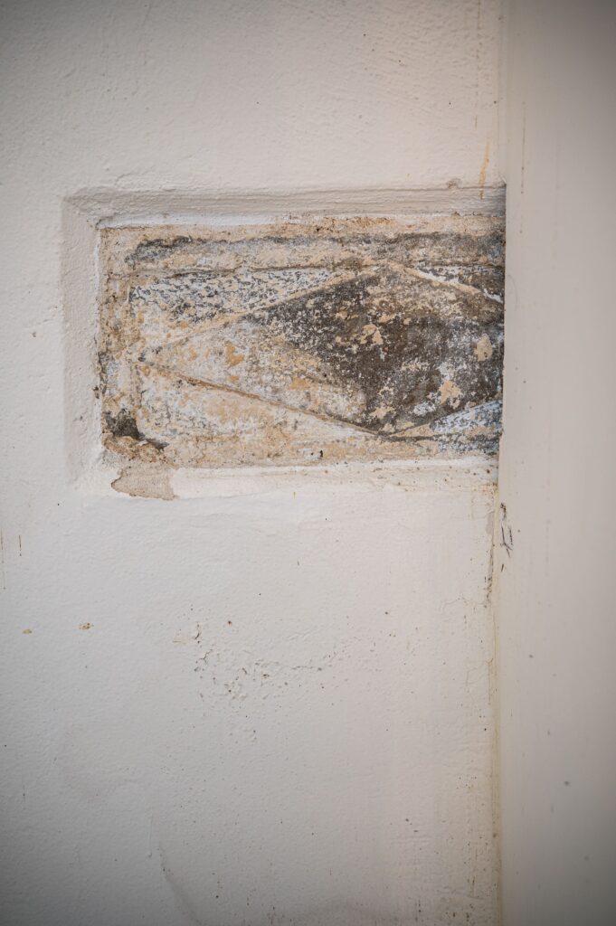 Ploča je uzidana u konstrukciju južnoga zida ulazne prostorije kod zapadne kule. U jednostavnoj profiliranoj traci reljefno je izveden romboidni ukras koji zauzima čitavu površinu ploče. Romboidni ukras  pripada ranijoj fazi dvorca (gotika i renesansa). Kad bi se razriješilo pitanje konstrukcijske funkcije toga dekorativnog elementa, bila bi olakšana i njegova datacija. Drugi ulomak se nalazi na zidu prostorije drugoga kata, identičan je što se tiče ukrasa i dimenzija i izrađen od iste vrste kamena.